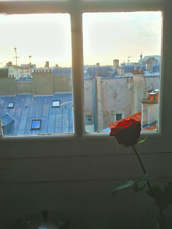 La soirée, après une bonne douche : séance fenêtre sur cours, la nuit est douce et il y a un feu d’artifice, derrière l’immeuble, a Montmartres.